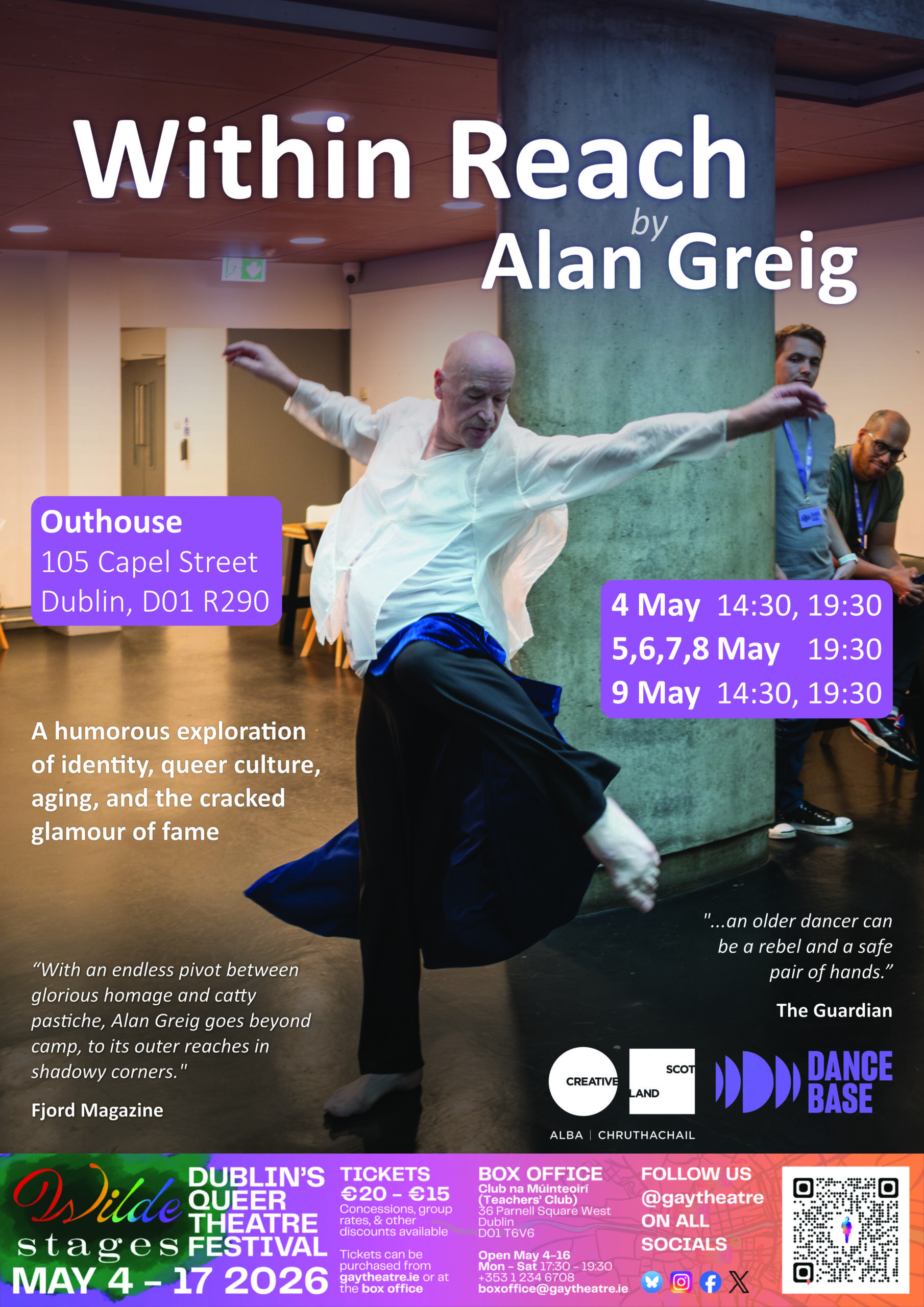 https://assemblyfestival.com/whats-on/636-within-reach Tickets are on sale now for my solo ‘Within Reach’ at the Edinburgh Fringe Festival 2024. The show was selected by The Scotsman as their dance ‘pick of the day’ and received a glowing review in the Guardian newspaper: “Finally, an unexpected pleasure: three shows only from veteran Scottish dance artist Alan Greig in Within Reach. Completely lo-fi, gathered in a corridor next to some lockers among other locations, 62-year-old Greig treats us to monologues and dance vignettes, recalling Tennessee Williams and Joan Crawford with wit and warmth. “Old age ain’t no place for sissies,” he quotes Bette Davis, but the joy of older performers is they know exactly who they are; by dint of defying the art form’s cult of youth, an older dancer can be a rebel and a safe pair of hands.” And a rather lovely review under the title ‘Iconic’ https://fjordreview.com/blogs/all/iconic